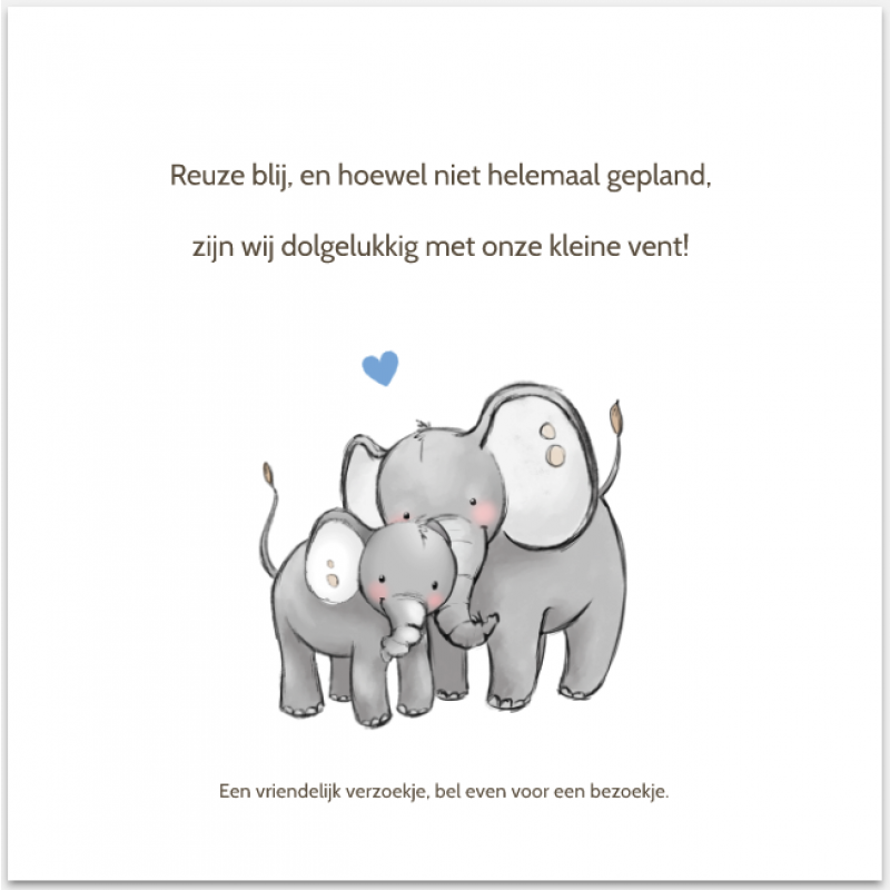 Schattig geboortekaartje met getekend diertje erop. Het babyolifantje glimlacht naar de kijker. Bestel dit kaartje op mooi natuurkarton.