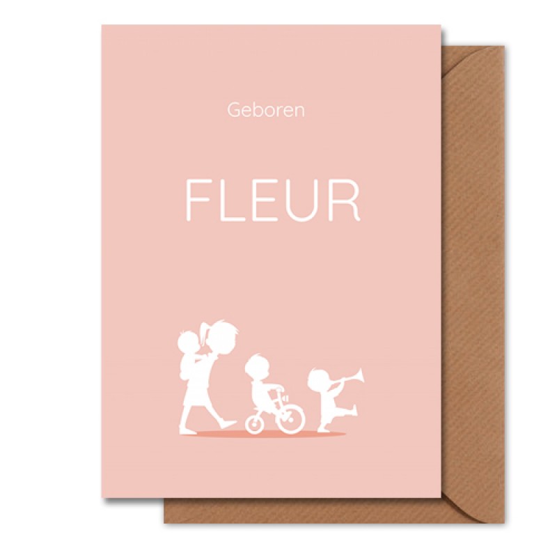 Strak en modern geboortekaartje met een rij kinderen in silhouet. de grootste draagt de pasgeboren baby op haar rug. De geslachten van de kinderen zijn makkelijk aan te passen, zodat dit een kaartje wordt dat helemaal bij jouw gezinssamenstelling hoort.