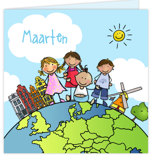 Geboortekaartje vierde kindje jongen op wereldbol met contouren van Europa. Grachtenpanden en molen op de achtergrond. Plaats eenvoudig een andere samenstelling op onze website.
