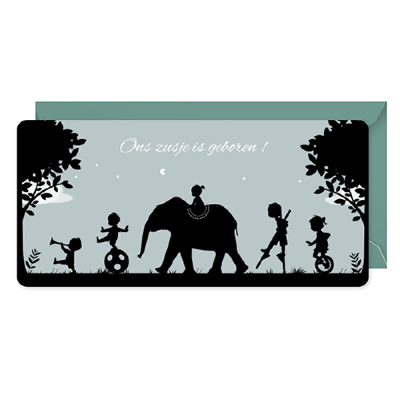 Geboortekaartje in een vrolijke circusachtige sfeer. Het kleinste kindje zit op een olifant en wordt vergezeld door vier grote broers en zus met een trompet, op een bal of stelten. Al deze silhouetjes staan als jongen of meisje in onze beeldbank. Je kunt van de silhouetjes op dit kaartje dus makkelijk je eigen gezinssamenstelling maken.