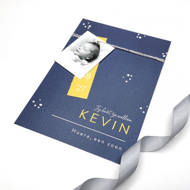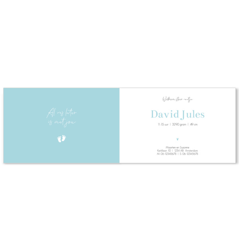 Geboortekaartje voor een jongen met twee kleine voetjes in blauwe watercolor en een klein blauw hartje onder de naam en geboortedatum.