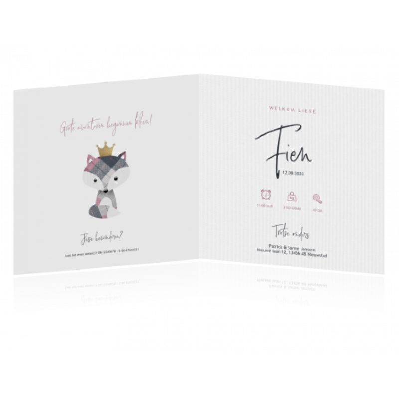 Schattig geboortekaartje met een paars vosje met gouden kroontje. Erg origineel!