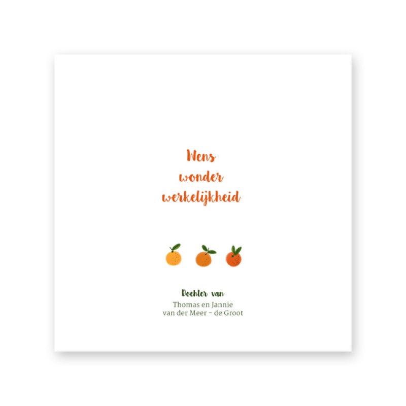 Vrolijk geboortekaartje met sinaasappeltjes en blaadjes. Pas het kaartje aan in de editor en maak er hét geboortekaartje van voor jullie kindje! Heb je een vraag of kom je er niet uit, mail gerust!