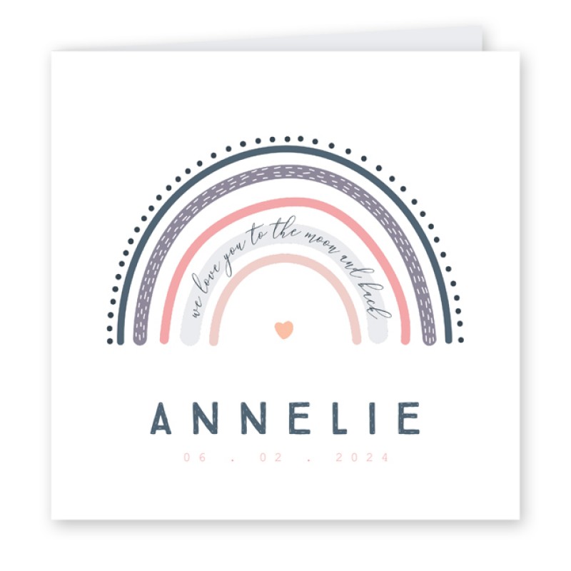 Lief geboortekaartje met geschilderde regenboog in blauw, paars en roze. Pas het kaartje aan in de editor en maak er hét geboortekaartje van voor jullie kindje! Heb je een vraag of kom je er niet uit, mail gerust!
