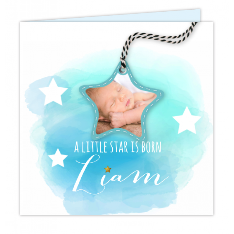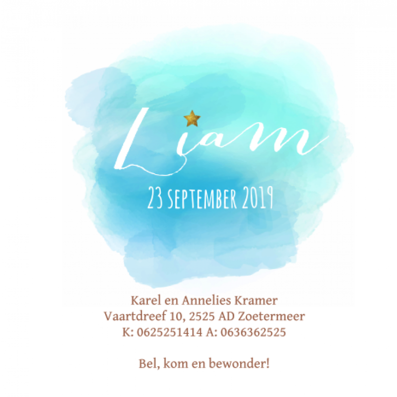 Lief geboortekaartje met watercolor achtergrond en mooie sterretjes.