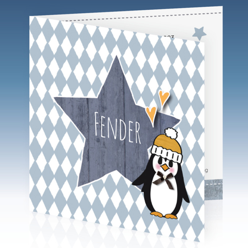 Lief winters geboortekaartje met een pinguïn voor een zoon. Plaats de naam van jullie kindje op de grijze ster.