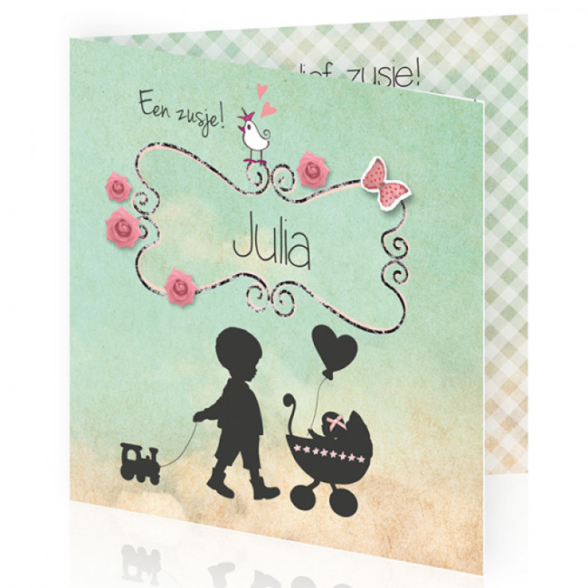 Een kleurrijk zomers geboortekaartje met bloesem, vrolijke vogels en een lief klein vogeltje in een draagzak. Mooie zomerse roze en rode kleurstelling. De kaart wordt gestanst in een hartvorm.
