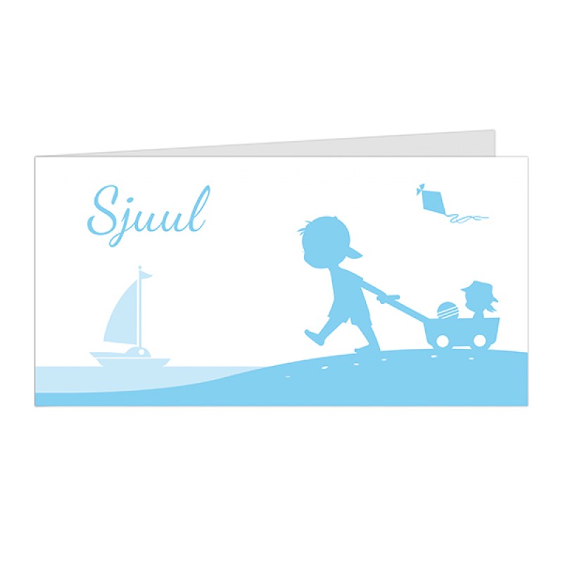 Zomers geboortekaartje waarop je een grote broer ziet die in een bolderkar zijn kleine zusje op het strand meetrekt. De kleuren kun je aanpassen naar je eigen smaak, en ook de tekst is makkelijk te veranderen. En met code PK-01mis je eerste kaartje gratis!