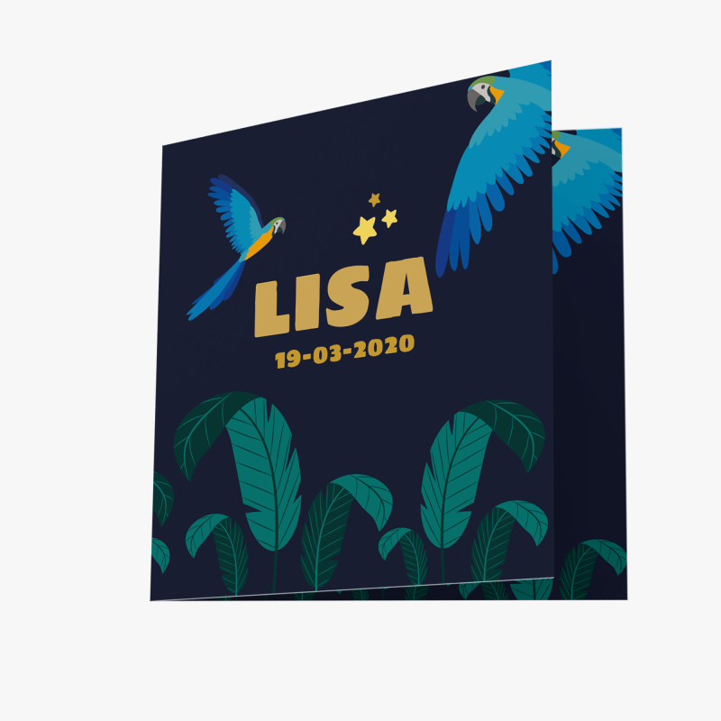 Een stoer geboortekaartje voor jongens en meisjes. De kaart is zwart maar krijgt vrolijke tinten door het jungle thema met papegaaien en junglebladeren. Ook de binnenkant is op deze manier afgewerkt.